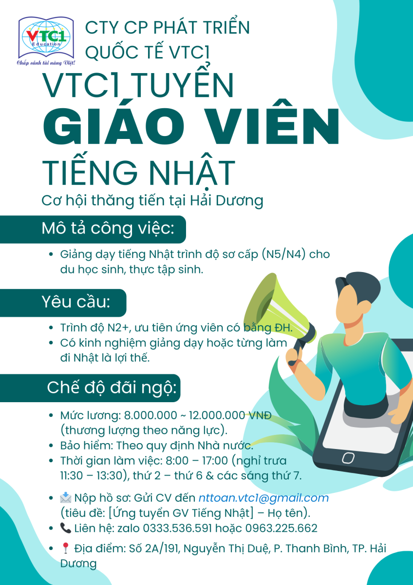 📩 Nộp hồ sơ: Gửi CV đến nttoan.vtc1@gmail.com (tiêu đề: [Ứng tuyển GV Tiếng Nhật] – Họ tên).